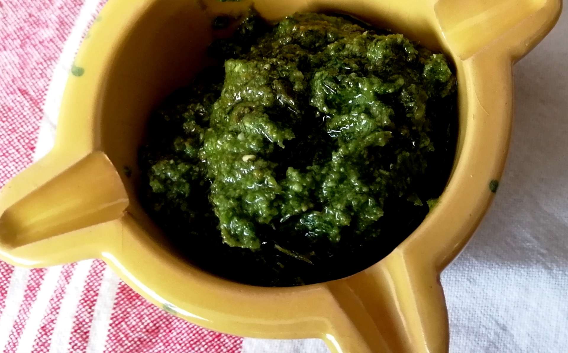 El pesto es una salsa italiana, genovesa concretamente, que se hace con albahaca y piñones, muy sabrosa y apropiada para acompañar carnes, pasta...