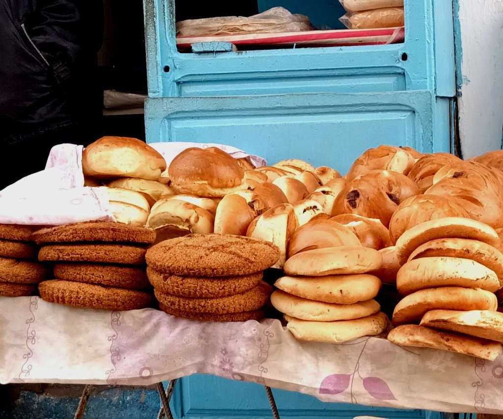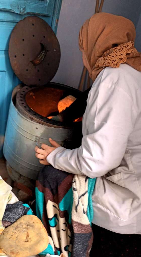 Hay un pan muy característico que hacen las mujeres en un horno rústico, se llama khobz tabouna. En una de las calles de un zoco una mujer elaboraba pan pegando la masa a las paredes de un horno cilíndrico para cocerlos. Está riquísimo.