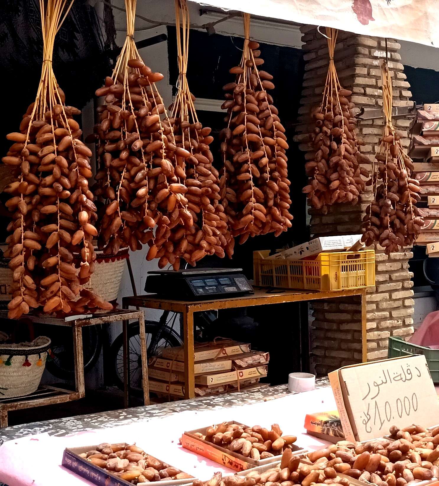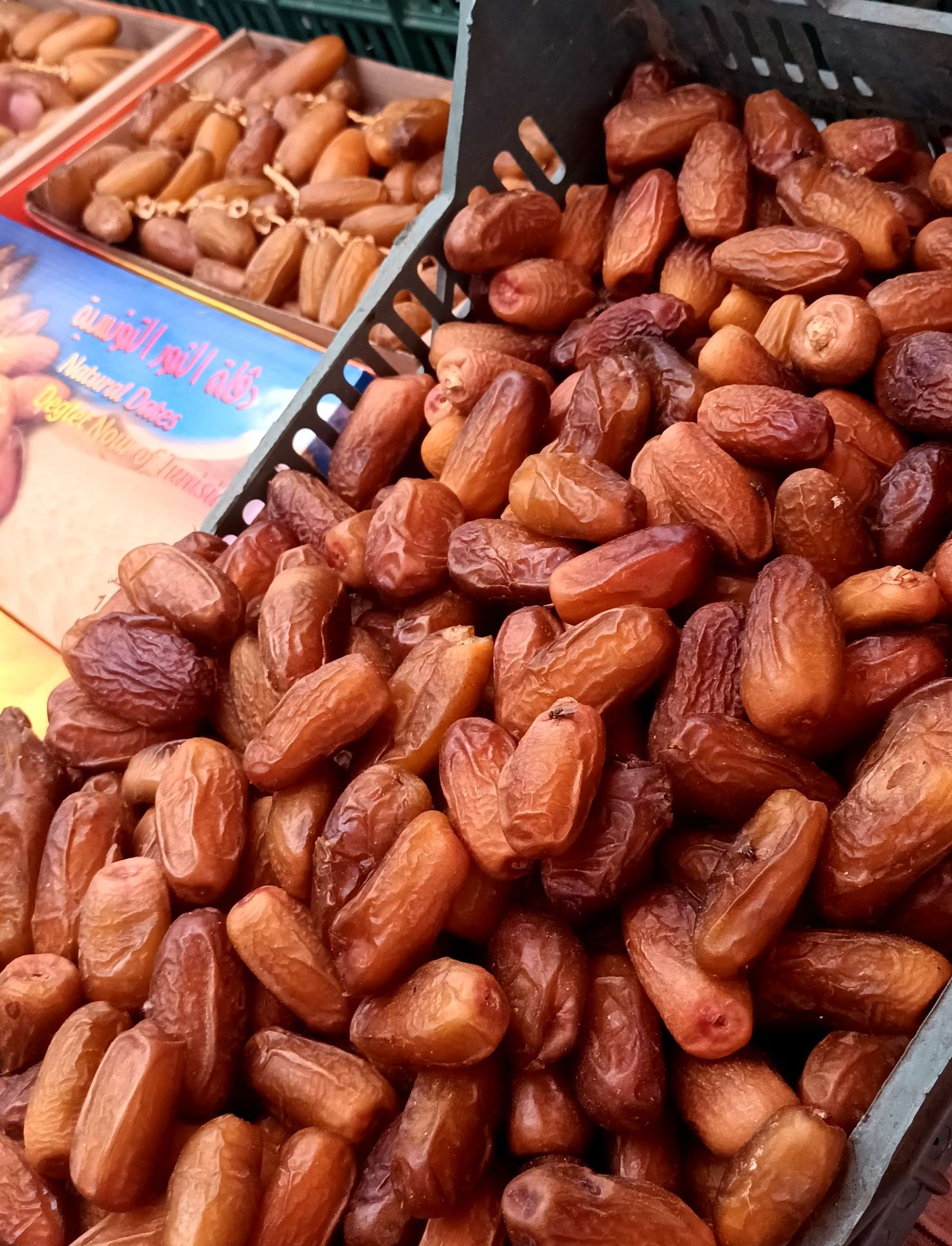 Entre los frutos secos y los dulces se encuentran los dátiles que son una marca de identidad de Túnez, los venden en puestos callejeros, mercados y tiendas, y se toman solos o rellenos con pasta de almendras o confitados.