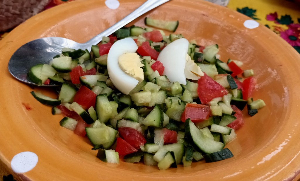 La ensalada típica tunecina lleva pepino, tomate, pimiento y cebolla roja, todos picados, y es agradable y sabrosa.